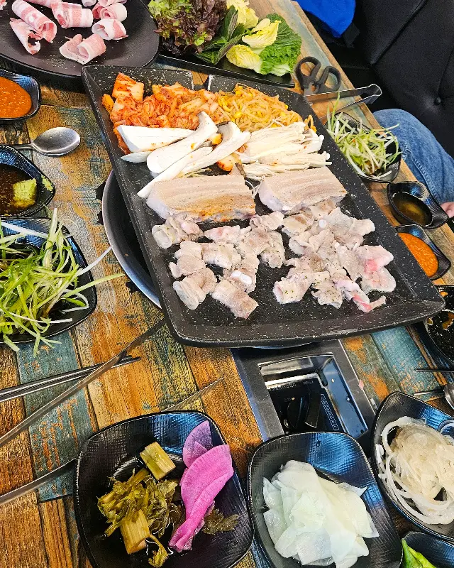 넓찍한 테이블에 대패 삼겹살 한 상 푸짐하게 차려놓으니, 마음까지 풍족해지는 기분!