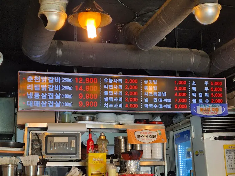 가게 문을 열고 들어서니, 생각보다 아담하고 깔끔한 내부가 눈에 들어왔어. 테이블 간 간격도 적당해서 편안하게 식사할 수 있는 분위기. 메뉴판을 보니 춘천 닭갈비(250g)가 12,900원, 넉넉하게 리필 닭갈비(250g)는 14,900원! 우리는 당연히 리필 닭갈비로 주문했지. 닭갈비에 라면 사리 추가는 필수 코스잖아? 당연히 라면 사리(2,000원)도 추가했다.