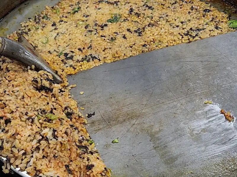 볶음밥이 넓게 펼쳐져 있는 철판