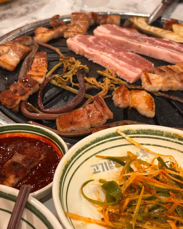다음 타자는 목살이었다. 삼겹살과는 또 다른 매력을 지닌 부위였다. 지방이 적고 살코기가 많아 담백한 맛이 일품이었다. 목살 역시 불판 위에서 마이야르 반응을 일으키며 먹음직스러운 갈색으로 변해갔다. 잘 익은 목살을 쌈 채소에 올리고 쌈장, 마늘, 고추를 곁들여 한 입 가득 먹으니, 신선한 채소의 향긋함과 목살의 담백함이 어우러져 환상의 조합을 이루었다.