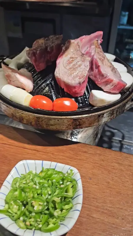 가게 내부는 생각보다 넓고 쾌적했다. 테이블 간 간격도 넉넉해서 옆 테이블의 소리에 방해받지 않고 오롯이 음식에 집중할 수 있는 환경이었다. 은은한 조명이 따뜻한 분위기를 연출하며, 테이블마다 놓인 환풍시설이 깔끔한 인상을 더했다. 후각은 이미 활성화되었다. 희미하게 감지되는 숯불 향과 은은한 양고기 향이 식욕을 자극하기 시작했다. 마치 실험실에 들어서기 전, 완벽하게 준비된 환경을 마주한 과학자처럼 설레는 기분이었다.