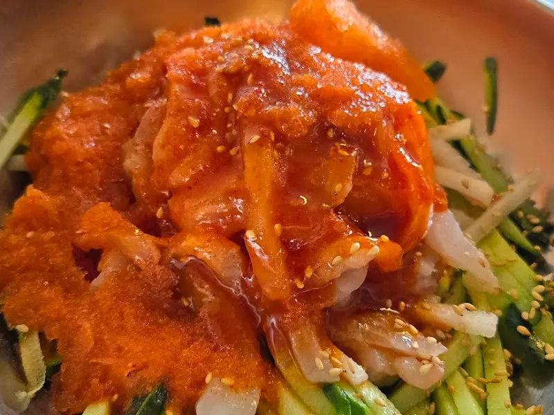 Oh My God! 이 맛은 레전드, 내 혀가 샌드! 새콤달콤한 양념이 입안에서 팡팡 터지는데, 회의 신선함과 채소의 아삭함이 찰떡궁합. 특히, 넉넉하게 들어간 회가 씹는 맛을 더해줘. 물회는 밥이랑 국수 중에 선택 가능한데, 나는 당연히 국수 선택! 면발이 탱글탱글 살아있어서, 물회랑 같이 먹으니 완전 환상적인 조합이었어. 나중에는 밥까지 말아서 싹싹 긁어먹었지.