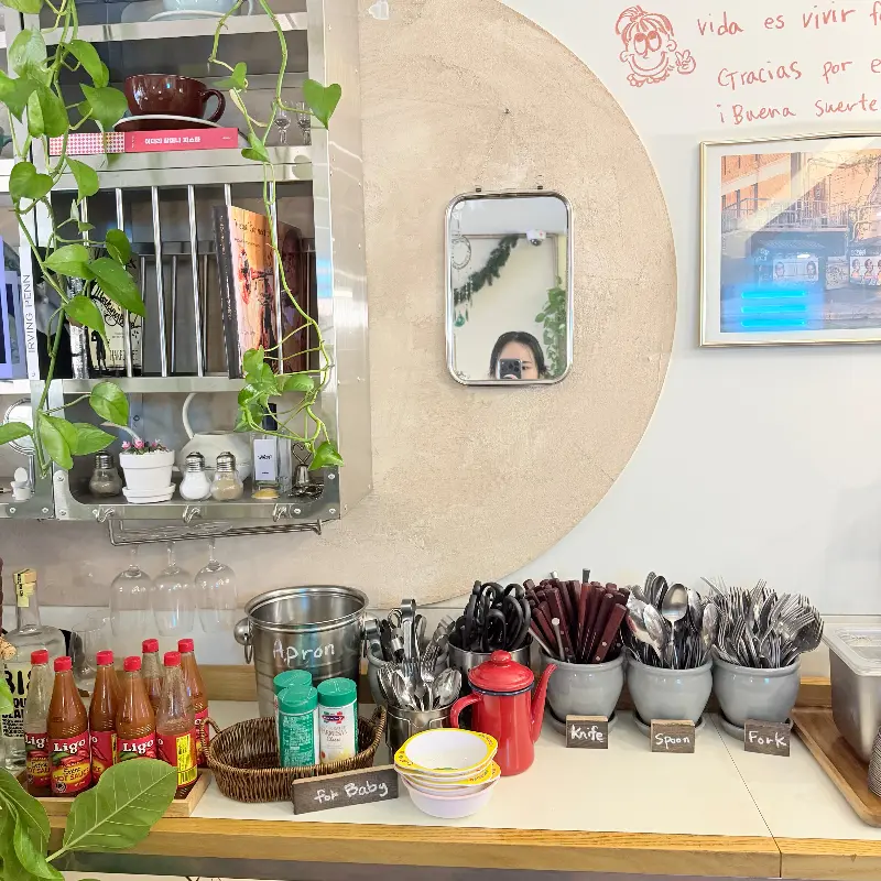 가게 문을 열자마자 아늑하고 따뜻한 분위기가 나를 감쌌다. 은은한 조명과 아기자기한 인테리어 소품들이 편안함을 더했고, 곳곳에 놓인 초록 식물들이 생기를 불어넣고 있었다. 혼자 온 손님들을 위한 자리도 마련되어 있어서 부담 없이 식사를 즐길 수 있다는 점이 마음에 들었다. 벽면에 걸린 칠판에는 손글씨로 적힌 메뉴와 그림들이 정겨움을 더했고, 흘러나오는 잔잔한 음악은 식사 분위기를 한층 더 고조시켜 줬다. 마치 친구 집에 놀러 온 듯한 편안함 덕분에 긴장감 없이 메뉴를 고를 수 있었다. 특히 인테리어에 신경 쓴 듯한 모습이 돋보였는데, 초록 식물들이 곳곳에 배치되어 있어 싱그러운 느낌을 주었다. 참고)