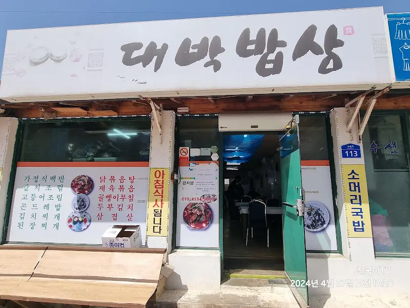 정선아리랑센터에서 미팅을 마치고, 늦은 저녁 식사를 해결하기 위해 정선 지역명 맛집을 찾아 나섰다. 해가 뉘엿뉘엿 지는 시간, 꼬르륵거리는 배는 이미 과학적인 분석을 멈추고 맹목적인 식사만을 갈망하고 있었다. 정선역 건너편, ‘대박밥상’이라는 간판이 눈에 들어왔다. 간판에서부터 느껴지는 범상치 않은 기운. 마치 오래된 실험실 문을 여는 과학자처럼, 기대와 설렘을 안고 가게 안으로 발걸음을 옮겼다.