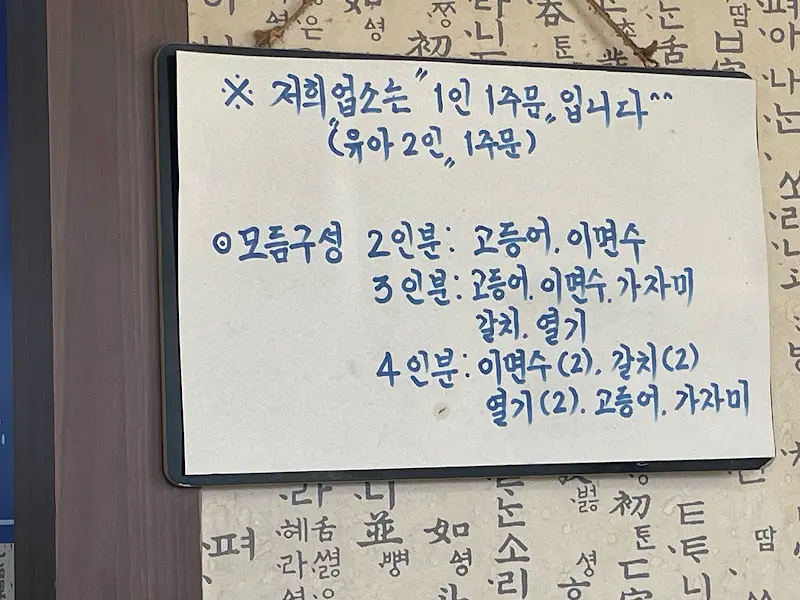 문을 열고 들어서니, 왁자지껄한 활기 속에 정겨운 식당 풍경이 펼쳐졌다. 테이블마다 놓인 푸짐한 생선구이 접시와 돌솥밥은 보는 것만으로도 식욕을 자극했다. 벽에 붙은 메뉴판을 보니, 1인분에 12,000원이라는 착한 가격이 눈에 띈다. 요즘 같은 고물가 시대에 이런 가격이라니, 그저 놀라울 따름이다. 메뉴 구성에 대한 안내문이 눈에 띄었다. 인원수에 따라 고등어, 이면수, 가자미, 갈치, 열기 등이 다채롭게 구성된다고 한다. 혼자 방문했음에도 불구하고, 다양한 생선을 맛보고 싶은 마음에 넉넉하게 2인분을 주문했다.