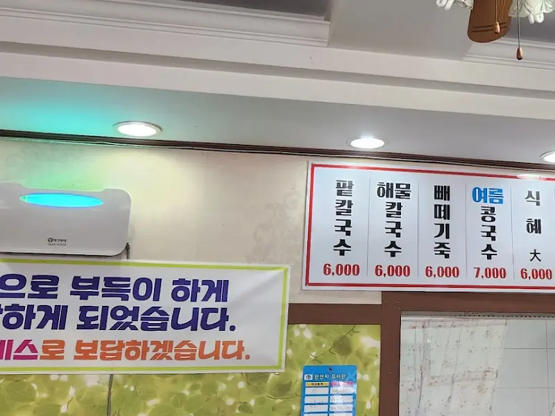 문을 열고 들어서니, 생각보다 깔끔한 내부가 눈에 들어왔다. 테이블 몇 개가 놓인 아담한 공간이었지만, 정돈된 모습에서 주인장의 꼼꼼함이 엿보였다. 벽에 붙은 메뉴판에는 팥칼국수와 해물칼국수가 나란히 적혀 있었고, 그 옆에는 여름 메뉴인 콩국수도 보였다. 가격을 확인하니 요즘 물가를 생각하면 믿기지 않을 만큼 착한 가격이었다. 마치 시간을 거슬러 올라간 듯한 기분에 묘한 설렘마저 느껴졌다.