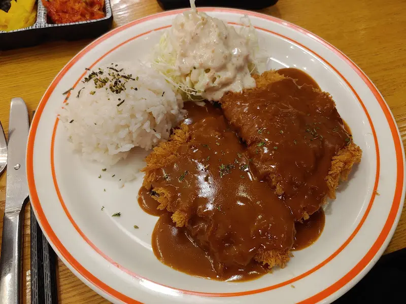 얼마 지나지 않아, 드디어 기다리고 기다리던 ‘반반 돈까스’가 테이블 위에 놓였다. 일반 돈까스와 치즈 돈까스가 나란히 놓인 모습은 보기만 해도 군침이 돌았다. 갓 튀겨져 나온 돈까스의 따뜻한 온기가 코끝을 간지럽혔다. 돈까스 위에는 윤기가 자르르 흐르는 소스가 듬뿍 뿌려져 있었고, 샐러드와 밥이 함께 제공되어 풍성한 한 끼 식사를 완성했다.