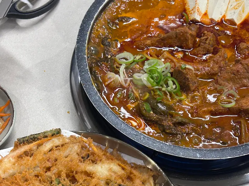 함께 나온 빠삭 오징어 튀김전 또한 기대 이상이었다. 쌀가루로 튀겨낸 덕분에 튀김옷은 정말 바삭했다. 젓가락으로 튀김전을 찢을 때마다 바삭하는 소리가 경쾌하게 울려 퍼졌다. 튀김옷 안에는 오징어와 새우가 듬뿍 들어 있어 씹는 맛을 더했다. 튀김 자체로도 훌륭했지만, 갓김치 등갈비찜 국물에 살짝 찍어 먹으니 그 맛이 배가 되었다. 매콤한 국물과 바삭한 튀김의 조화는 상상 이상이었다.