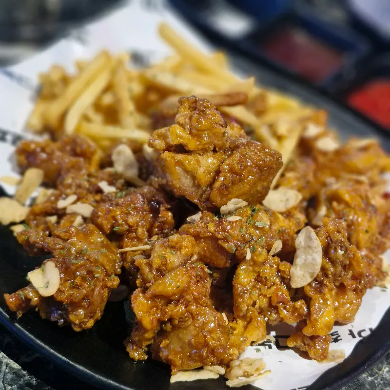 “그놈포차”의 치킨은 겉은 바삭하고 속은 촉촉한, 그야말로 겉바속촉의 정석이었어요. 특히, 갓 튀겨져 나온 따끈한 치킨은 입안 가득 퍼지는 고소함과 촉촉한 육즙이 일품이었죠. 튀김옷은 과하지 않게 얇고 바삭해서 느끼함 없이 깔끔하게 즐길 수 있었습니다. 함께 제공되는 감자튀김 또한 바삭하고 짭짤해서 맥주 안주로 제격이었어요. 특히, 2만 원 이상 주문 시 순살 치킨 반 마리를 서비스로 제공하는 이벤트는 정말 감동적이었습니다. 맛있는 치킨을 저렴한 가격에 즐길 수 있다니, 이보다 더 좋을 순 없겠죠?