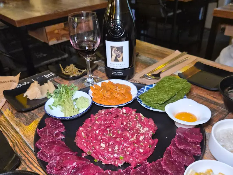 함평세트 2 (육회+우니+뭉티기): 85,000원. 뭉티기, 육회에 신선한 우니(성게알)까지 더해진 메뉴입니다. 고급스러운 맛의 조화가 일품이며, 특별한 날을 기념하기에 더할 나위 없이 좋습니다. 입 안에서 터지는 바다 향과 육회의 풍미가 어우러져 잊을 수 없는 맛을 선사합니다. 특히, 감태 위에 초대리밥을 올리고 육회와 우니를 함께 올려 먹으면 그야말로 천상의 맛!