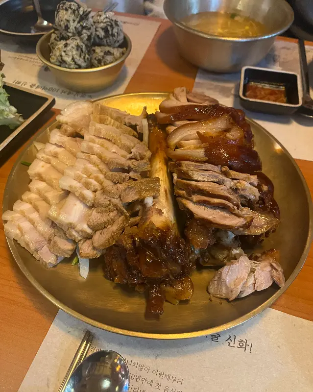 젓가락으로 족발 한 점 집어서 입으로 직행! 야들야들이라는 단어는 이럴 때 쓰는 거구나… 진짜 입에서 살살 녹는다는 표현이 딱 맞았다. 잡내 하나 없고, 껍데기는 쫀득쫀득, 살코기는 촉촉하고 부드럽고… 이거 완전 레전드다. 특히 새우젓이랑 같이 먹으니까 감칠맛이 확 살아나는 게, 쉴 새 없이 젓가락질하게 만드는 마성의 맛이었다.