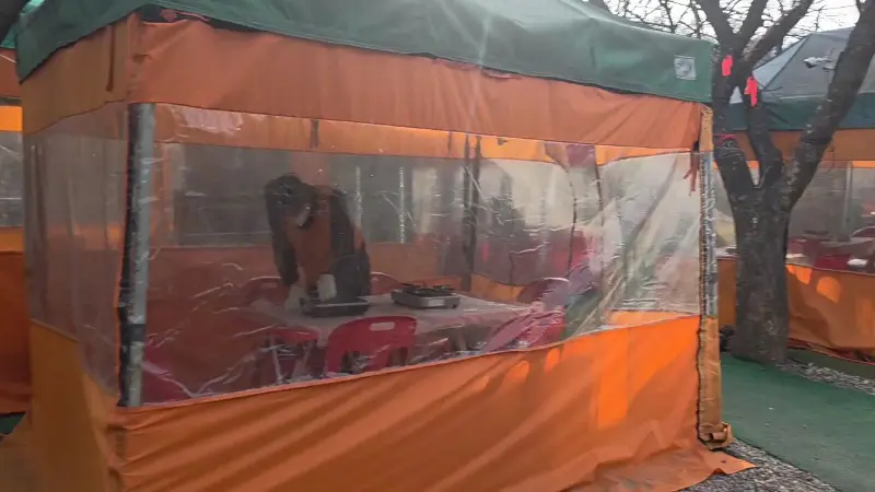 오렌지색 천막 아래 아늑한 테이블들이 놓여진 야외 좌석. 마치 캠핑장에 온 듯한 기분!