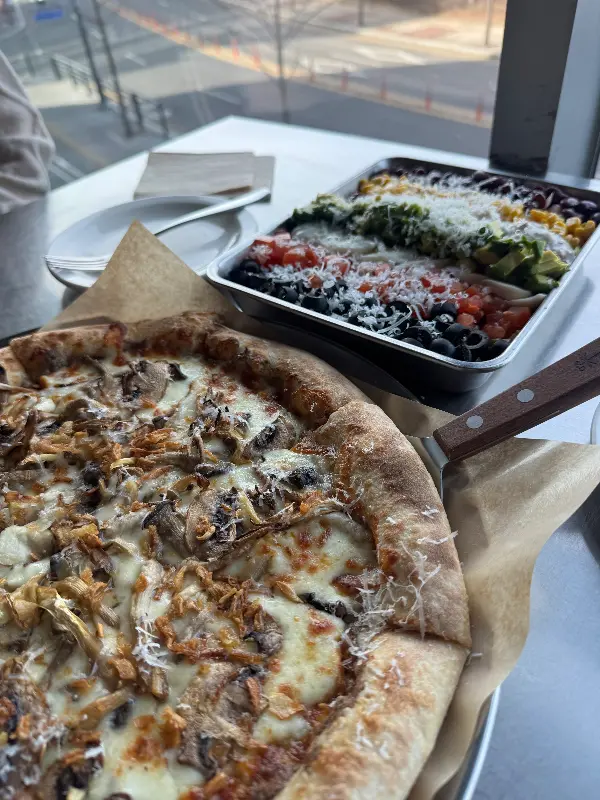 콥샐러드를 정신없이 흡입하고 있을 때, 드디어 머쉬룸 피자가 나왔다. 갓 구워져 나온 따끈따끈한 피자 비주얼에 또 한 번 심쿵! 얇고 쫀득한 도우 위에 버섯이 가득 올라가 있고, 치즈가 쭈욱 늘어지는 모습은 진짜… 말잇못. 버섯 향이 은은하게 퍼지는 게 진짜 식욕을 자극했다.