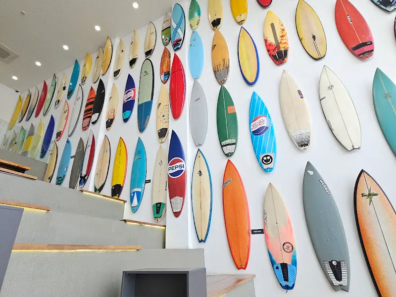 높은 층고에 🤩 한쪽 벽면을 가득 채운 알록달록한 서핑보드들이 시선을 강탈한다. 완전 힙해! 🏄♀️ 🏄♂️ 인테리어 진짜 미쳤다! 여기가 바로 그 유명한 포토 스팟이구나. 나도 질 수 없지, 바로 폰 꺼내서 폭풍 셔터질📸.