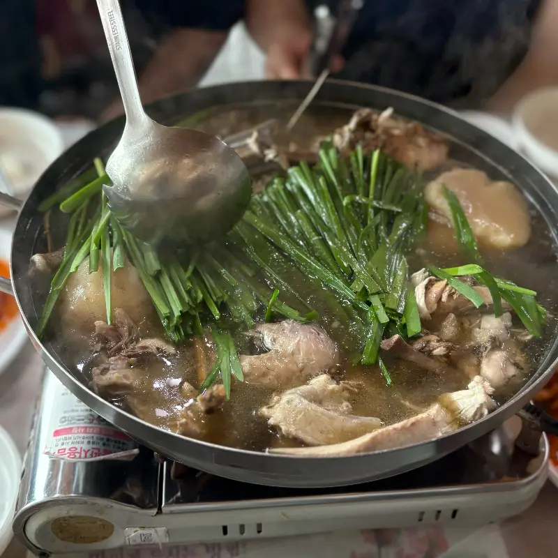 드디어, 오늘의 주인공인 능이오리백숙이 등장했다. 거대한 냄비 안에는 큼지막한 오리 한 마리와 능이버섯, 그리고 신선한 부추가 듬뿍 담겨 있었다. 짙은 갈색 국물에서는 깊고 그윽한 향이 끊임없이 피어올랐다. 마치 거대한 과학 실험 도구처럼, 냄비는 끓기 시작하며 김을 뿜어냈다.