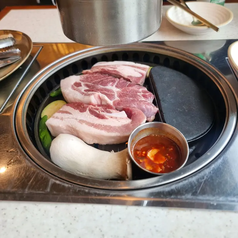 문을 열자, 훈훈한 온기가 감돌았다. 은은하게 퍼지는 참나무 장작 향은 마치 깊은 숲속에 들어선 듯한 착각을 불러일으켰다. 테이블마다 놓인 숯불 화로 위로 연기가 피어오르고, 그릴 위에서 지글거리는 흑돼지 오겹살의 향긋한 냄새가 코를 간지럽혔다. 활기 넘치는 직원들의 목소리와 손님들의 웃음소리가 어우러져 편안하면서도 활기찬 분위기를 자아냈다.