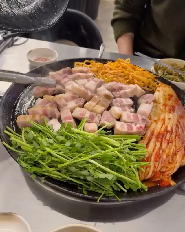 솥뚜껑에 삼겹살, 김치, 콩나물, 미나리가 함께 구워지는 모습