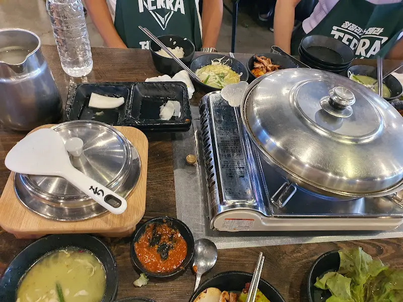그리고, 이 집의 또 다른 자랑거리, 바로 오리탕입니다! 큼지막한 뚝배기에 담겨 나온 오리탕은, 보기만 해도 속이 확 풀리는 듯한 비주얼을 자랑했어요. 깻잎이 듬뿍 들어간 국물은, 매콤하면서도 시원한 맛이 일품이었습니다. 오리고기의 느끼함을 싹 잡아주는, 그런 깔끔한 맛이었어요.