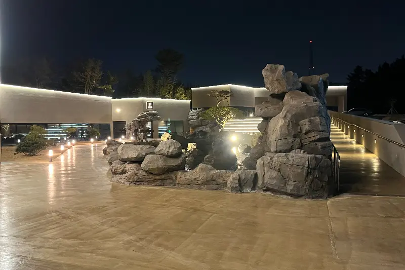 주차장부터가 남달라. 3천 평 부지에 떡하니 자리 잡고 있어서 주차 공간 걱정은 아예 할 필요가 없어. 차에서 내리자마자 보이는 웅장한 폭포가 진짜 예술이야. 에서 볼 수 있듯이, 밤에 조명까지 더해지니까 완전 환상적인 분위기더라고. 마치 고급 호텔에 온 것 같은 느낌이었어. 를 보면 알겠지만, 건물 외관도 엄청 신경 쓴 티가 나. 돌과 조명을 조화롭게 사용해서 고급스러움을 더했더라.
