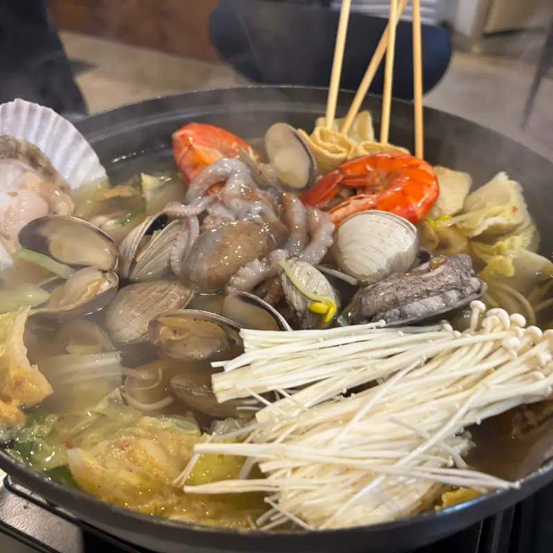 주문하고 얼마 지나지 않아 해물탕 등장! 비주얼 진짜 대박… 냄비 가득 푸짐하게 담긴 해산물 보고 입이 떡 벌어졌다. 싱싱한 가리비, 새우, 꿈틀거리는 낙지, 키조개, 그리고 시원한 배추까지! 냄새부터가 이미 게임 끝났음. 칼칼하면서도 시원한 국물 냄새가 코를 찌르는데, 이건 무조건 소주 각이다 싶었다.