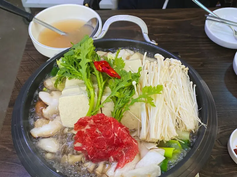 잠시 후, 묵직한 놋그릇에 담긴 두부전골이 모습을 드러냈다. 뽀얀 두부, 붉은 빛깔의 고기, 싱싱한 채소, 그리고 황금빛 팽이버섯이 조화롭게 어우러진 모습은 마치 잘 설계된 분자 요리 같았다. 냄비 안에서 부글부글 끓는 육수는 시각적인 아름다움과 함께 후각을 자극하는 향기를 뿜어냈다.