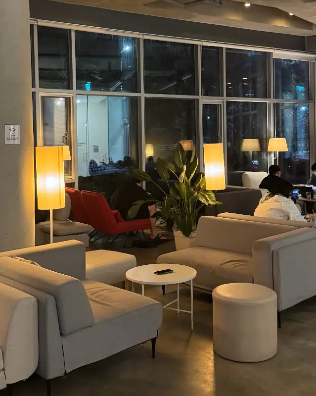 문을 열고 들어서자, 예상보다 훨씬 넓고 쾌적한 공간이 눈앞에 펼쳐졌다. 높은 천장과 넓은 테이블 간 간격 덕분에 답답함 없이 여유로운 분위기를 만끽할 수 있었다. 1층은 편안한 소파 좌석과 낮은 테이블이 주를 이루어 담소를 나누기에 적합해 보였고, 2층은 스터디 카페처럼 조용하고 집중하기 좋은 분위기였다. 늦은 시간임에도 불구하고 많은 사람들이 노트북을 두드리거나 책을 읽으며 자신만의 시간을 보내고 있었다.