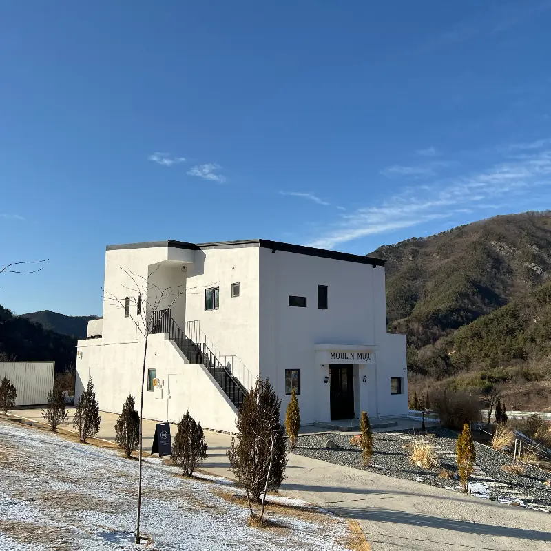 굽이굽이 산길을 따라 올라가니, 저 멀리 하얀 건물이 눈에 들어왔다. 마치 프랑스 시골 마을에 있을 법한 아담하고 예쁜 외관! 주변 풍경과 어우러지는 모습이 진짜 그림 같았다. 주차장에 차를 대고 내리자마자, 맑은 공기가 폐 속 깊숙이 들어오는 느낌! 역시 무주 클라스…👍
