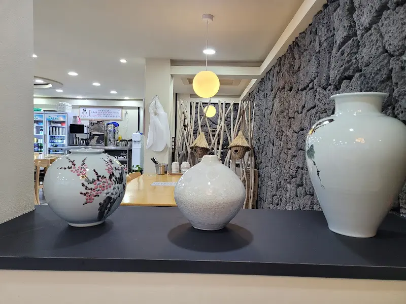 식당 문을 열고 들어서자, 생각보다 넓고 깔끔한 공간이 눈에 들어왔다. 은은한 조명 아래 놓인 나무 테이블들이 편안한 분위기를 자아냈다. 한쪽 벽면은 제주도의 상징인 현무암으로 장식되어 있어, 제주 특유의 분위기를 더했다. 커다란 창밖으로는 함덕 해변이 한눈에 들어왔다. 에메랄드빛 바다와 하얀 백사장이 어우러진 풍경은 그야말로 그림 같았다. 마치 바다 위에 떠 있는 듯한 착각이 들 정도였다.