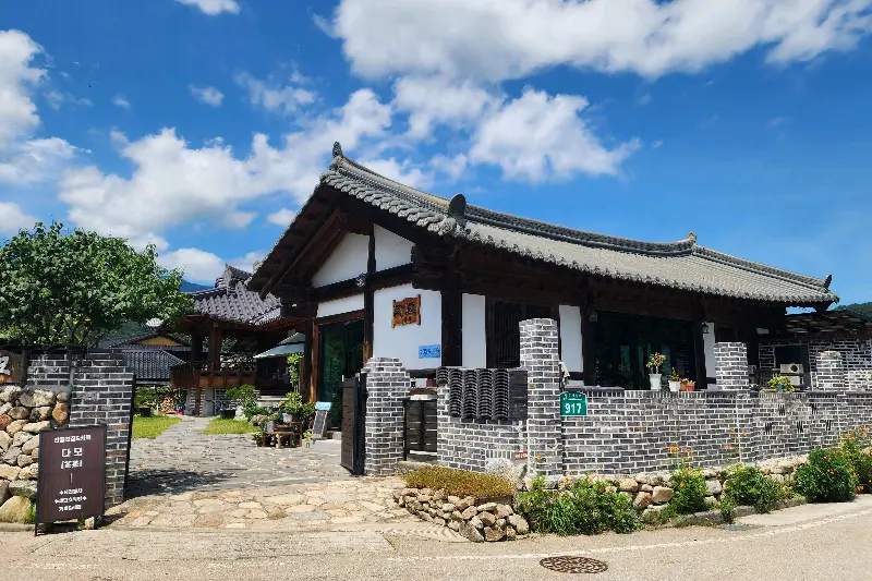 굽이굽이 산길을 따라 들어가니, 거짓말처럼 그림 같은 풍경이 눈 앞에 펼쳐졌다. 와… 진짜 대박이라는 말밖에 안 나왔다. 푸른 하늘 아래 고즈넉하게 자리 잡은 한옥마을의 모습은 마치 시간 여행을 온 듯한 착각을 불러일으켰다. 돌담길을 따라 천천히 걸으니 마음이 평온해지는 기분이었다. 드디어 ‘다모’가 눈에 들어왔다!