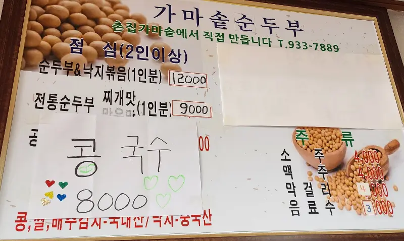 가마솥순두부의 메뉴판. 직접 만든 순두부라는 문구가 눈에 띈다.