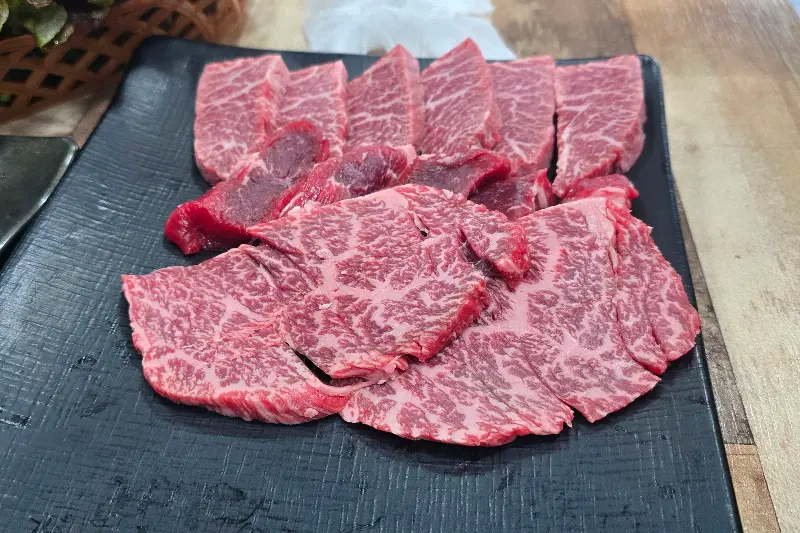 우리는 고민 끝에 한우 특수부위 모듬(1인분 25,000원) 2인분과 등심(1인분 28,000원) 1인분을 주문했다. 특수부위는 그날그날 신선한 부위로 구성된다고 하는데, 어떤 부위가 나올지 기대하는 재미가 있었다. 등심은 마블링이 예술이라는 후기를 많이 봐서 꼭 먹어보고 싶었다. 그리고 식사 메뉴로 물냉면(8,000원)과 된장찌개(5,000원)를 추가했다. 고기를 먹고 난 후 시원한 냉면과 구수한 된장찌개는 필수 코스니까!