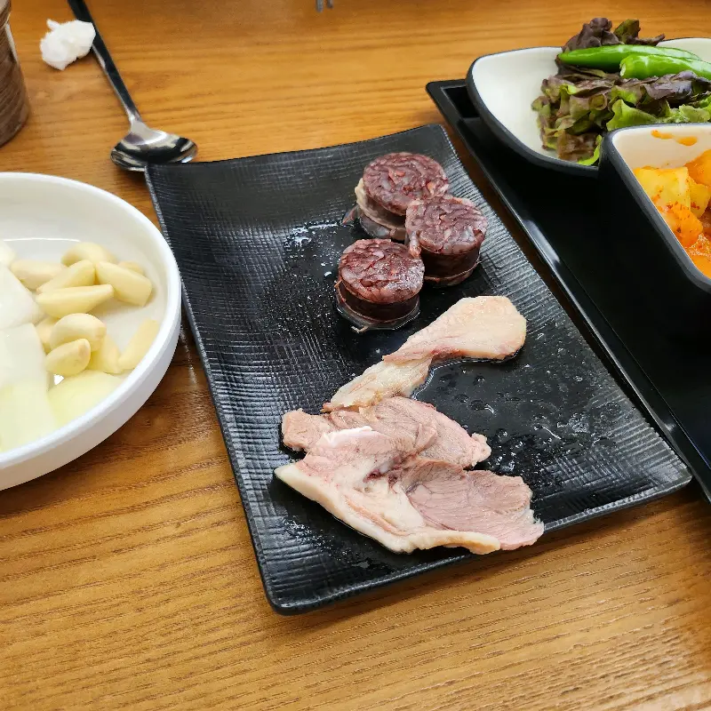 경자국밥의 차별점은 여기서부터 시작됩니다. 와 4에서 확인할 수 있듯, 국밥이 나오기 전 ‘맛보기 수육’과 ‘순대’가 제공된다는 점입니다. 야들야들한 수육은 콜라겐 함량이 높아 피부 탄력에 기여할 뿐 아니라, 입 안에서 부드럽게 녹아내리며 황홀경을 선사했습니다. 특히 돼지 특유의 잡내가 전혀 느껴지지 않았는데, 이는 경자국밥만의 특별한 비법, 즉 효소나 발효균을 이용한 과학적인 숙성 과정을 거쳤기 때문이라고 추측해 봅니다. 순대 또한 일반적인 당면 순대가 아닌, 찹쌀과 각종 채소가 듬뿍 들어간 ‘진짜’ 순대였습니다. 쫄깃한 식감과 풍부한 맛이 혀를 즐겁게 했습니다. 마치 잘 설계된 실험 도구처럼, 식사 전 제공되는 수육과 순대는 미각을 깨우고 식욕을 증진시키는 완벽한 ‘애피타이저’ 역할을 수행했습니다.