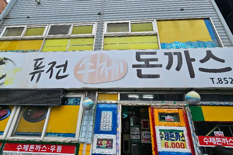여행 첫날, 짐을 풀자마자 곧장 퓨전수제돈까스로 향했다. 쨍한 햇볕 아래, 파란 하늘과 푸른 바다가 어우러진 율포해수욕장의 풍경은 정말 그림 같았다. 해변을 따라 늘어선 식당들을 지나, 드디어 퓨전수제돈까스 간판이 눈에 들어왔다. 간판 글씨체가 왠지 모르게 정겹다. 가게 외관은 소박했지만, 묘하게 끌리는 분위기가 있었다. 사진에서 봤던 알록달록한 외관이 눈에 띈다. 9년 전 가격 그대로라는 문구가 붙어있는 걸 보니, 가격도 착한 것 같아 더욱 기대감이 커졌다.