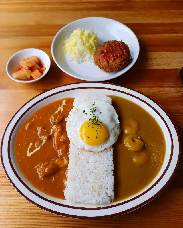 잠시 후, 기다리던 음식이 나왔다. 카레는 사진에서 보던 것보다 훨씬 먹음직스러웠다. 밥 위에 반숙 계란 프라이가 얹어져 있었고, 카레 위에는 신선한 파슬리가 뿌려져 있었다. 멘치 카츠는 큼지막한 크기를 자랑하며, 겉은 바삭하고 속은 촉촉해 보였다. 한눈에 보기에도 정성이 가득 담긴 음식이라는 것을 알 수 있었다.