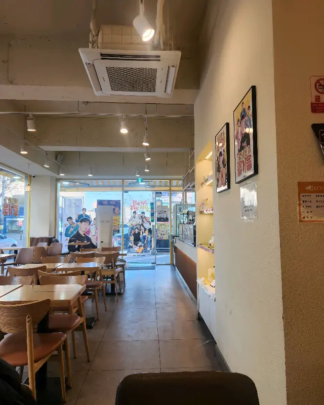 카페 문을 열고 들어서자, 생각보다 넓고 쾌적한 공간이 눈에 들어왔다. 은은한 조명 아래 나무 테이블과 의자가 놓여 편안한 분위기를 자아냈고, 벽면에는 아기자기한 그림들이 걸려 있어 갤러리에 온 듯한 느낌마저 들었다. 평일 낮 시간이라 그런지 한산해서 더욱 여유롭게 시간을 보낼 수 있을 것 같았다.