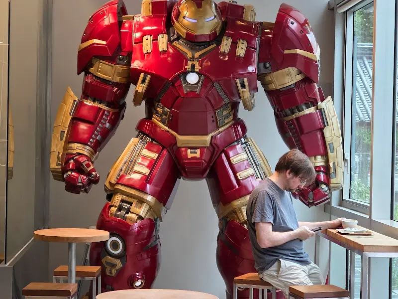 문을 열자마자 시선을 강탈하는 건 다름 아닌 거대한 헐크버스터 피규어였다. 붉은색과 금색의 조합이 웅장하면서도 어딘가 모르게 귀여운 느낌도 준다. 혼자 온 손님들을 심심하지 않게 해주려는 배려일까? 묵직한 갑옷을 입은 헐크버스터 옆 테이블에 자리를 잡았다. 마치 히어로 영화 속 한 장면에 들어온 듯한 기분. 왠지 모르게 나도 모르게 어깨가 으쓱해지는 기분이다.
