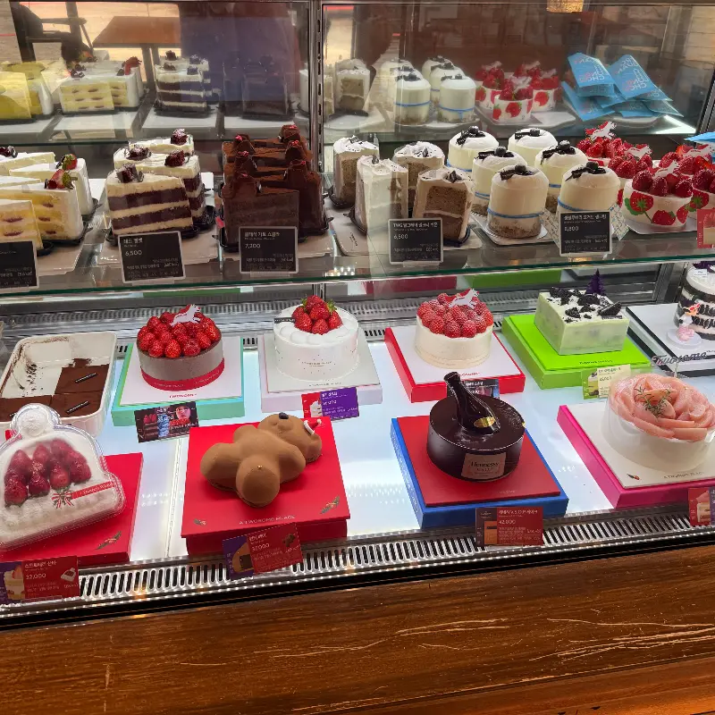 가장 먼저 눈에 들어온 것은 쇼케이스 안을 가득 채운 형형색색의 케이크들이었다. 딸기가 듬뿍 올려진 케이크부터, 초콜릿, 치즈, 고구마 등 다양한 종류의 케이크들이 보기 좋게 진열되어 있었다. 그중에서도 특히 시선을 사로잡은 것은 앙증맞은 곰돌이 모양의 케이크였다. 빨간색 상자 위에 놓인 갈색 곰돌이 케이크는 마치 크리스마스 선물처럼 사랑스러운 분위기를 풍겼다.