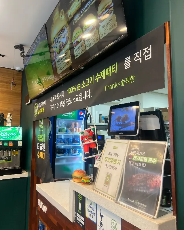 매장 문을 열자마자 확 느껴지는 깔끔함! 우드톤 인테리어에 초록색 포인트 컬러가 톡톡 튀는 게, 딱 요즘 애들이 좋아할 만한 분위기더라. 벽면에 붙어있는 메뉴판을 스캔하는데, 종류가 생각보다 다양해서 살짝 고민했어. 클래식한 프랭크 버거부터 시작해서, 치즈, 불고기, 심지어는 비프&치킨 버거까지! 결정장애가 있는 나는 한참을 서서 메뉴를 골랐다니까.