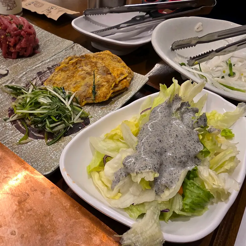 특히 눈길을 끈 것은 윤기가 좌르르 흐르는 육회였다. 젓가락으로 살짝 들어 맛보니, 입안에서 사르르 녹는 듯 부드러웠다. 신선함이 그대로 느껴지는 맛이었다. 육전 역시 얇게 부쳐져 나와, 고소하고 담백했다. 갈비를 굽기 전에 육회와 육전으로 입맛을 돋우니, 기대감이 더욱 커졌다. 샐러드도 신선했는데 흑임자 드레싱이 곁들여져 고소함을 더했다.