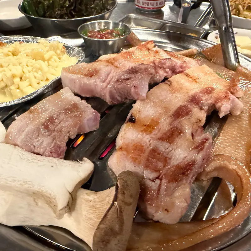 주문 후 얼마 지나지 않아, 테이블 위에는 푸짐한 밑반찬들이 차려졌다. 마늘쫑, 마카로니 샐러드, 쌈 채소 등 고기와 곁들여 먹기 좋은 반찬들이 하나같이 정갈하고 맛있어 보였다. 특히 눈길을 사로잡은 것은 뽀얀 마카로니에 치즈가 듬뿍 들어간 마카로니 치즈였다. 돼지껍데기와 마카로니 치즈의 조합이라니, 상상만으로도 군침이 싹 돌았다. 잠시 후, 드디어 기다리고 기다리던 돼지껍데기가 등장했다. 겉은 초벌이 되어 먹기 좋게 잘려 나온 껍데기의 윤기가 좌르르 흐르는 모습이 정말 먹음직스러웠다. 불판 위에 껍데기를 올리자, 지글거리는 소리와 함께 고소한 냄새가 코를 자극했다.