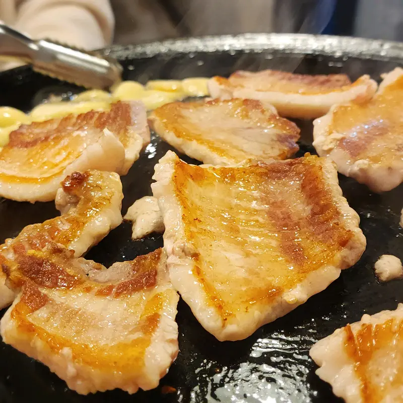 무쇠판에 올려진 삼겹살