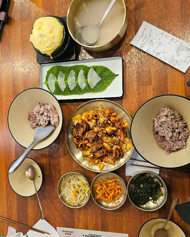 잠시 후, 드디어 기다리고 기다리던 쭈꾸미 볶음이 나왔다. 불향이 확 느껴지는 쭈꾸미는 보기만 해도 군침이 싹 돌았다. 쭈꾸미 외에도 콩나물, 무생채, 김가루 등 밥과 함께 비벼 먹기 좋은 반찬들이 함께 나왔다. 특히 다시마 무침은 새콤달콤한 게 내 입맛에 딱 맞았다. 밥은 갓 지은 밥처럼 밥솥째로 제공되는 점이 인상적이었다. 갓 지은 따뜻한 밥에 쭈꾸미 볶음을 슥슥 비벼 먹으니, 정말 꿀맛! 탱글탱글한 쭈꾸미의 식감과 매콤달콤한 양념이 환상적인 조화를 이루었다. 순한맛으로 시켰는데도 살짝 매콤한 게, 맵찔이인 나에게는 딱 좋은 정도였다.