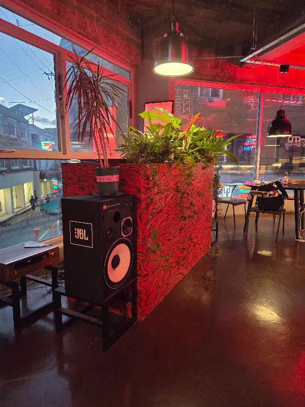 가게 한켠에 놓인 JBL 스피커와 붉은 색감의 조명이 힙한 분위기를 더한다.