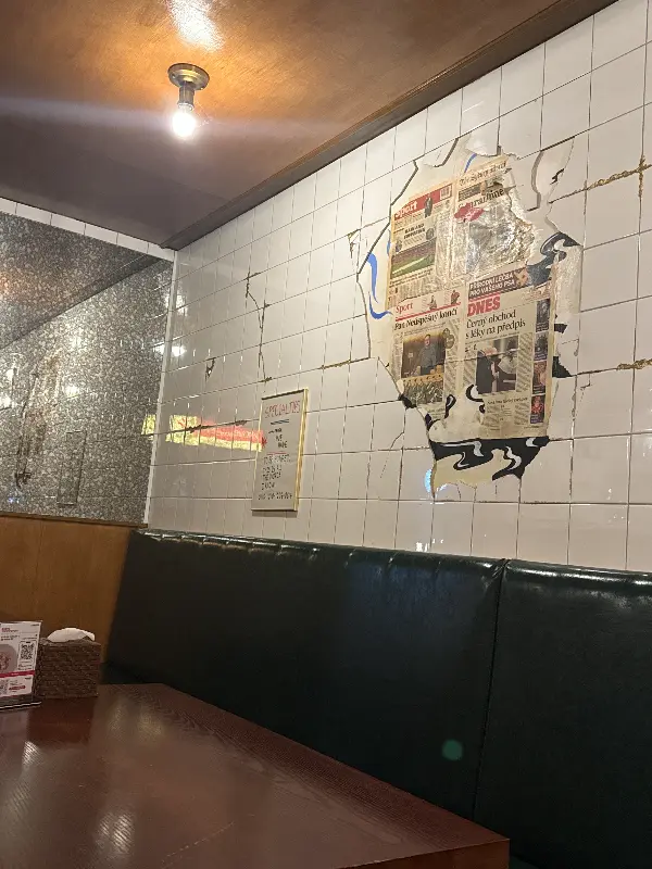 자리에 앉아 메뉴판을 펼쳐보니, 갈비찜, 보쌈, 전 등 다양한 메뉴들이 눈에 들어왔다. 역시 대표 메뉴는 매운 갈비찜인 듯했다. 매운맛을 워낙 좋아하는 나는 망설임 없이 매운 갈비찜 보통맛을 주문했다. 혹시나 매울까 봐 주먹밥도 함께 시켰다. 메뉴를 기다리는 동안 가게 안을 둘러봤다. 벽 한쪽에는 옛날 신문이 붙어 있는 독특한 인테리어가 눈길을 끌었다. 뭔가 정감 가면서도 세련된 느낌이랄까.