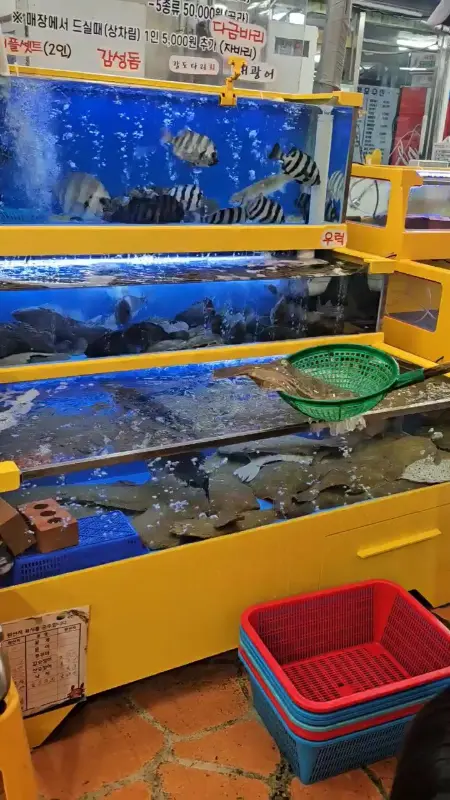 수산시장에 들어서자 활기 넘치는 분위기가 나를 반겼다. 여기저기서 들려오는 상인들의 목소리와 싱싱한 해산물이 가득한 수족관은 그야말로 장관이었다. 그중에서도 단연 눈에 띄는 것은 바다수산의 수족관! 어찌나 관리가 잘 되어 있는지 마치 거대한 아쿠아리움을 옮겨 놓은 듯했다. 아이들이 특히 좋아할 것 같다는 생각이 들었다. 🤩 맑고 깨끗한 물속에서 유유히 헤엄치는 물고기들을 보니 이곳의 신선함은 의심할 여지가 없겠다는 확신이 들었다.