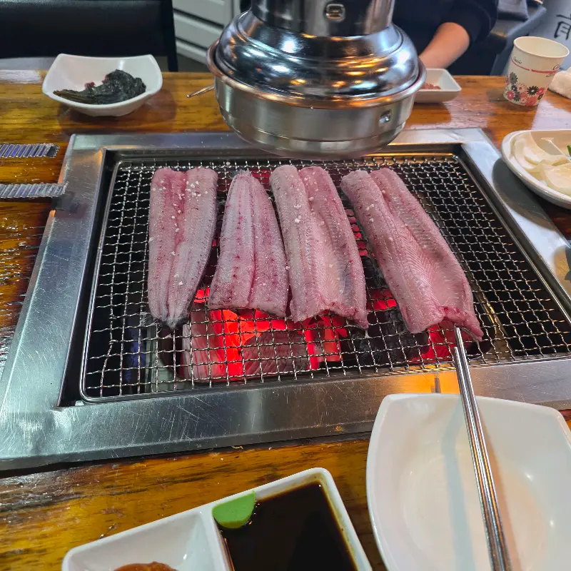 직원분께서 능숙한 솜씨로 장어를 숯불 위에 올려주셨다. 치익- 하는 소리와 함께 고소한 냄새가 코를 자극했다. 뜨거운 숯불 위에서 장어가 노릇노릇하게 익어가는 모습은 그야말로 예술이었다. 겉은 바삭하고 속은 촉촉하게 구워지는 장어를 보니, 저절로 침샘이 폭발했다.