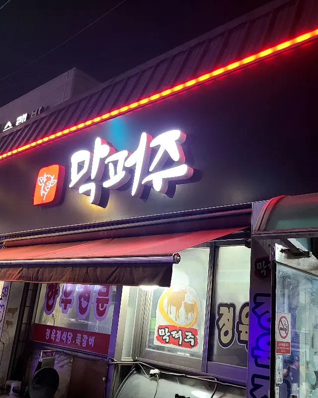 막퍼주에 도착하니, 역시나 사람들이 북적거린다. 혼자 온 손님은 나뿐인 것 같아 살짝 민망했지만, 친절한 직원분들이 편안하게 자리를 안내해 주셨다. 혼자 온 손님을 위한 배려인지, 구석진 자리가 오히려 아늑하게 느껴졌다. 테이블마다 환풍시설이 잘 되어 있어서 연기 걱정 없이 고기에 집중할 수 있겠다는 생각이 들었다. 에서 보듯, 붉은색 네온사인으로 빛나는 간판은 멀리서도 눈에 띄었고, 가게 안은 사람들로 북적였지만 활기찬 분위기가 느껴졌다. 혼자 왔지만 전혀 주눅 들지 않고 당당하게 소고기를 즐겨보리라 다짐했다.