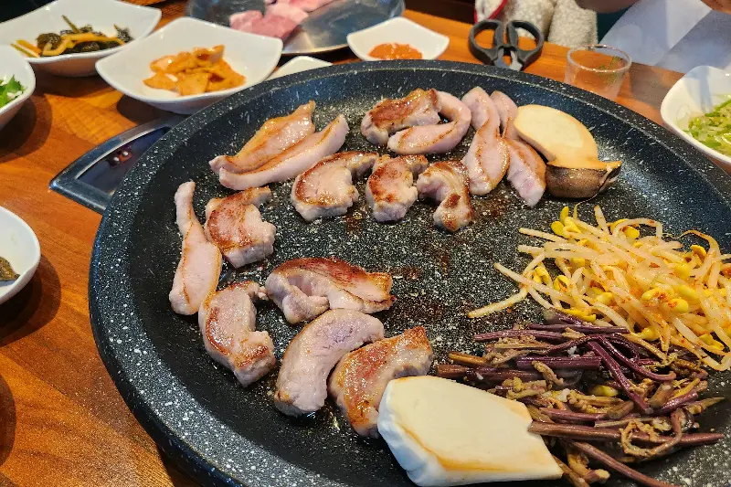주문을 마치자, 순식간에 밑반찬이 테이블을 가득 채웠다. 싱싱한 쌈 채소는 기본, 콩나물무침, 김치, 깻잎 장아찌 등 하나하나 정성이 느껴지는 반찬들이었다. 특히 깻잎 장아찌는 짭짤하면서도 향긋한 맛이 일품이었다. 메인 메뉴가 나오기 전에 젓가락이 쉴 새 없이 움직였다. 역시, 맛집은 밑반찬부터 다르다.