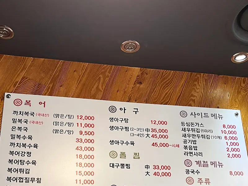 가게 문을 열고 들어서니, 생각보다 넓고 깔끔한 내부가 눈에 들어왔다. 테이블 간 간격도 적당하고, 혼자 앉아도 전혀 어색하지 않은 분위기였다. 혼밥 레벨 5 정도는 되는 나에게도 편안하게 느껴지는 공간이었다. 벽에 붙은 메뉴판을 보니, 복국뿐만 아니라 아구찜, 뽈찜 등 다양한 메뉴가 있었다. 하지만 나의 목표는 오직 하나, 시원한 복국이었다.