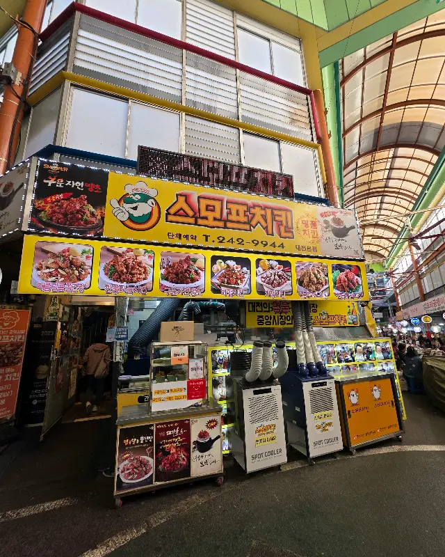 화려한 조명과 메뉴 사진으로 시선을 사로잡는 스모프치킨. 중앙시장 안에서 단연 눈에 띈다.